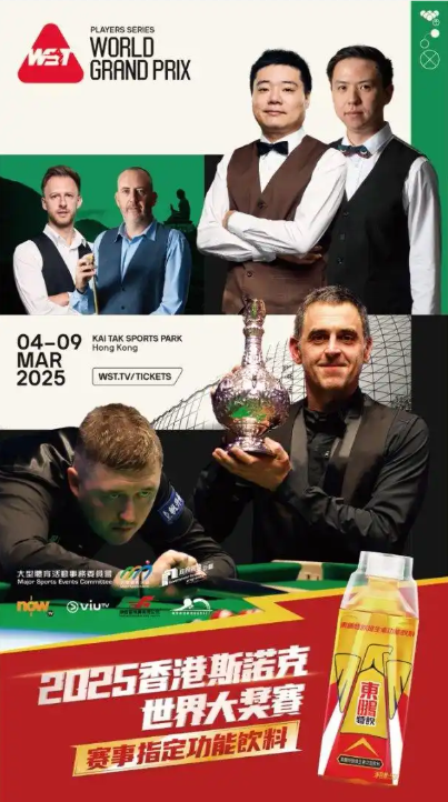 农民山泉曾资助斯诺克国际杯、英锦赛、大师赛和世锦赛,将品牌推行至国际商场。此外,2002年“红牛”成为斯诺克赛事的重要资助商之一,红牛饮料在当赛季(2022/2023)资助斯诺克“三大赛”(世锦赛、英锦赛、大师赛)以及威尔士公开赛。东鹏特饮资助了在香港举行的2025斯诺克国际大奖赛。还有男装品牌金利来成为2025年斯诺克国际大奖赛官方合作伙伴,并成为赛事接连三年的官方仅有指定服装品牌。